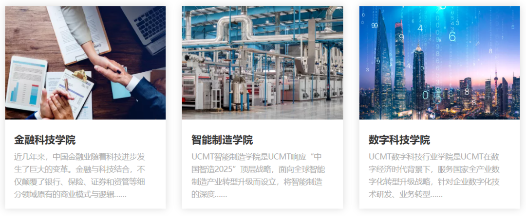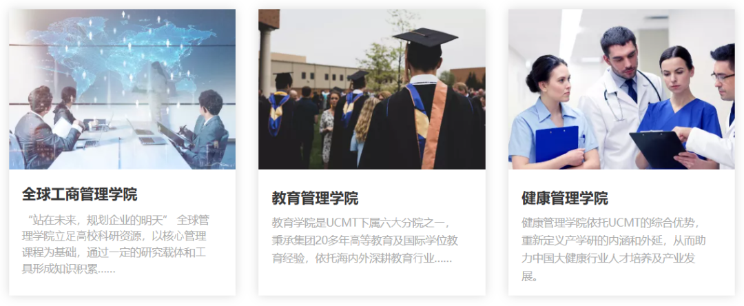 目前UCMT下设六大行业学院,分别为全球工商管理学院、教育管理学院、健康管理学院、金融科技学院、智能制造学院、数字科技学院。