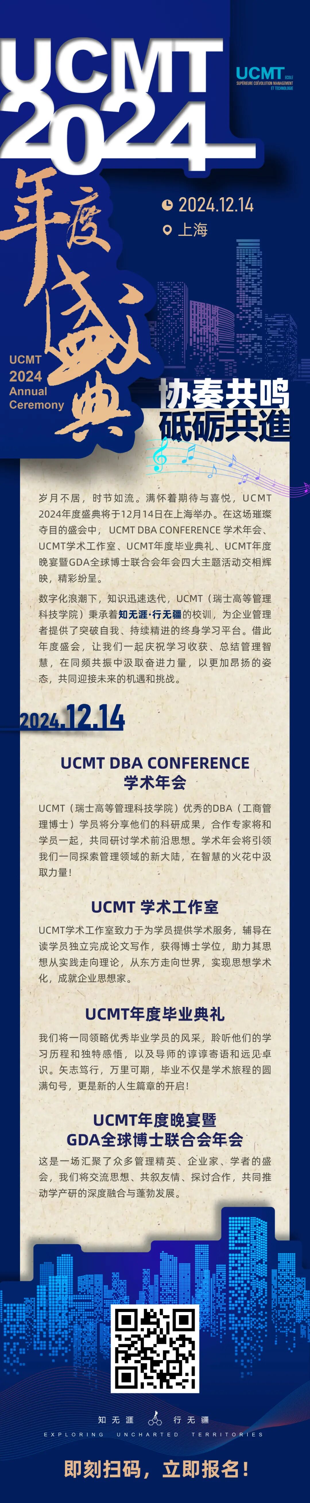 数字化浪潮下,知识迅速迭代,UCMT秉承着“知无涯·行无疆”的教学理念,为企业管理者提供了突破自我、持续精进的终身学习平台。
